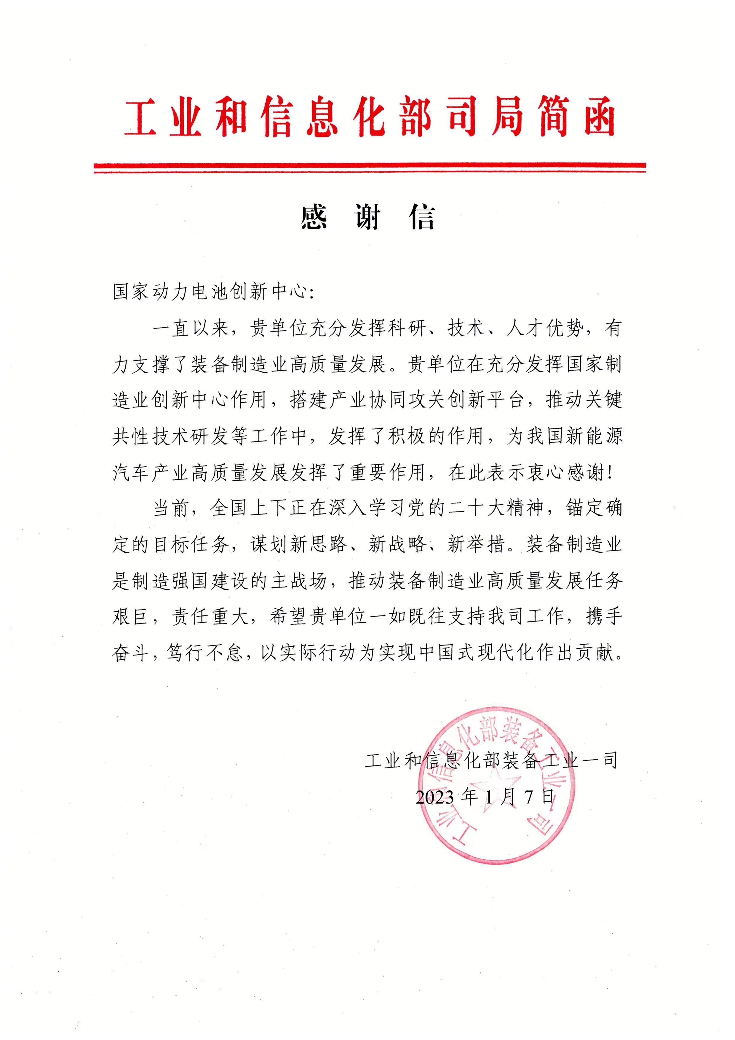 1月7日,工业和信息化部装备工业一司向国家动力电池创新中心发来感谢信,对国家动力电池创新中心为我国新能源汽车产业高质量发展发挥了重要作用,表示衷心感谢!