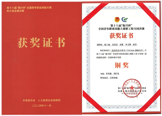 近日,第十八届“振兴杯”全国青年职业技能大赛职工组全国决赛落下帷幕。山东有研国晶辉团队凭借参赛项目《宽波段高分辨率CVD ZnSe制备技术》荣获大赛职工组专项赛(创新创效竞赛)全国决赛铜奖。