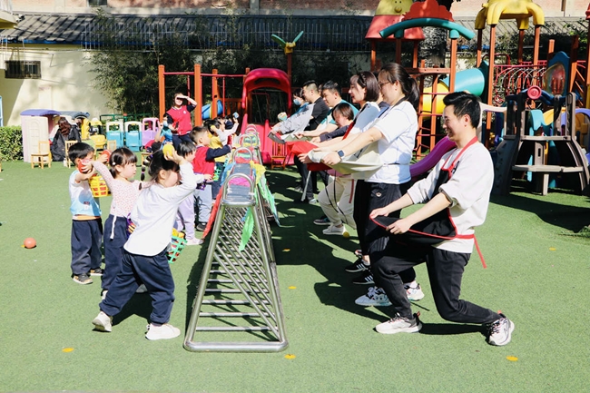 小班则是好玩的亲子运动会。结合小班幼儿的年龄特点,有研幼儿园设计了《母鸡下蛋》《给小兔子送萝卜》《猫和老鼠》《围裙接球》等趣味性、互动性强的亲子运动游戏;在体验运动带来快乐的同时,既增进了幼儿与同伴彼此之间的友谊,更增强了幼儿与家长之间的情感交流。小运动员们和爸爸妈妈们一起互动游戏,大家在欢声笑语中享受着幸福的亲子时光。