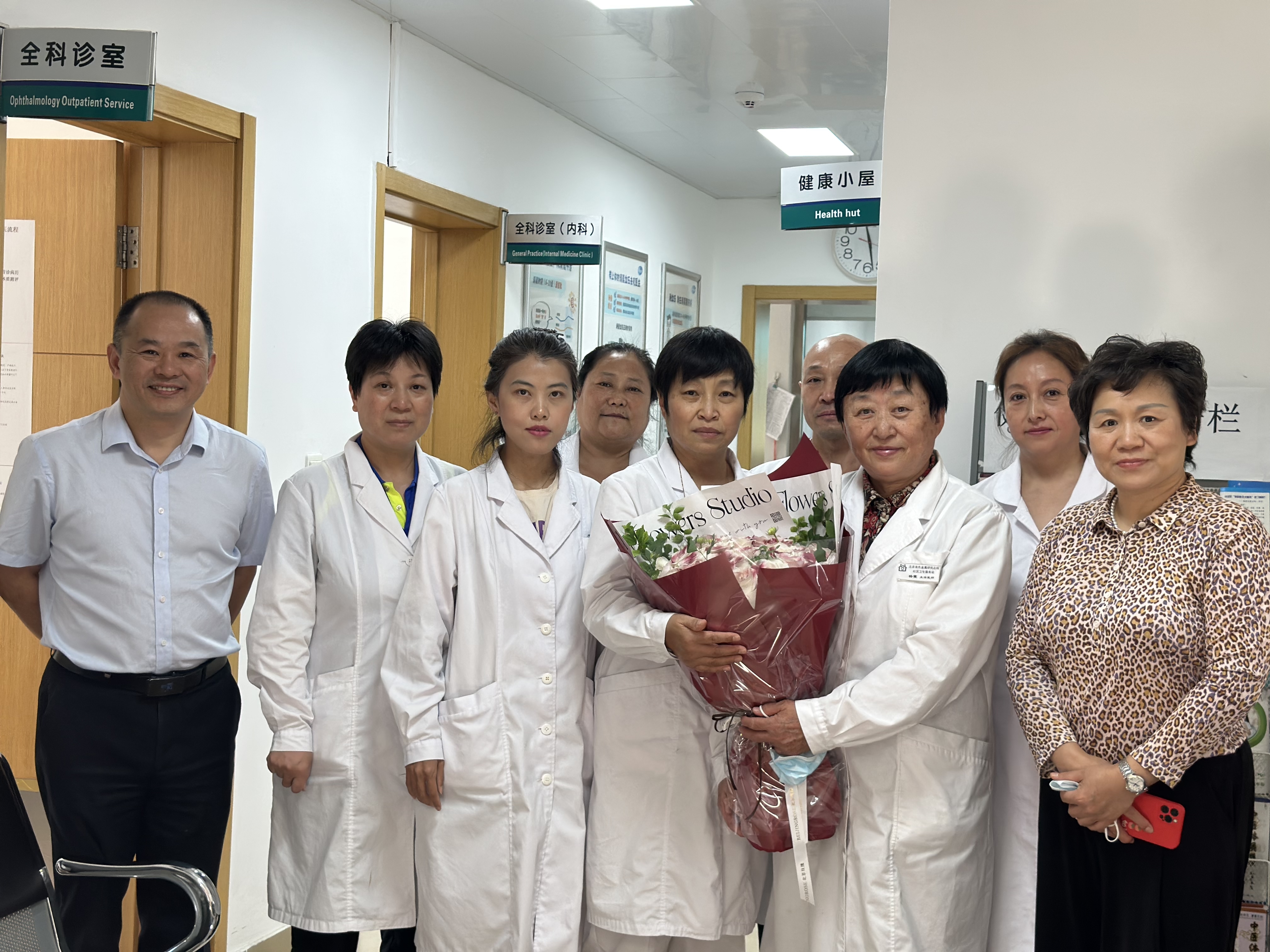 沈健一行先后走访了挂号室、内科诊室、药房,与医护人员亲切交谈,了解工作和生活状况,送上鲜花和祝福,对她们在基层卫生健康工作中做出的贡献和辛勤付出表示感谢。