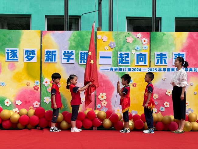 9月2日上午,有研幼儿园全体师幼聚集在操场,带着希望,带着憧憬,举行了新学期的开学典礼。大班升旗手高举着五星红旗入场,在庄严的国歌声中,五星红旗冉冉升起。
