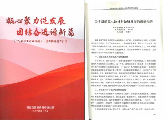日前,国务院国资委党委统战部发布《2024年度中央企业统战人士优秀调研报告汇编》,国联研究院九三学社社员卓浩翔、中共党员王建涛联合撰写的调研报告《关于新能源电池材料领域发展的调研报告》入选汇编。
