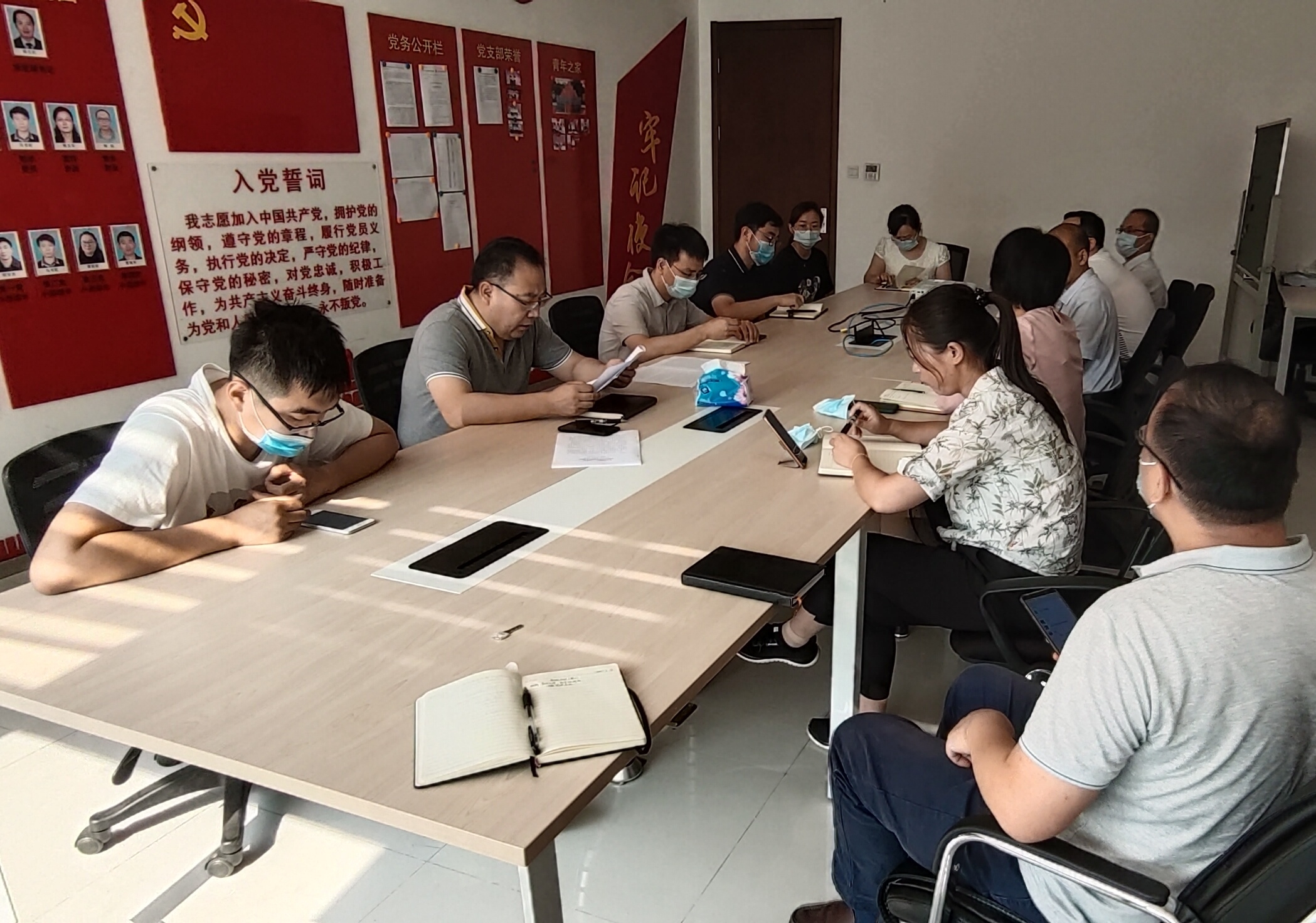 队伍成立初期,面对艰巨任务,党员同志在满腔热情的同时也出现信心不足的情绪。针对这一问题,党支部坚持用党的创新理论武装党员干部职工,做实“三会一课”,通过“一对一交流+集中交流”“集中学习+个人研读”“专题党课+交流讨论”等方式强化政治引领,提升队伍整体素质、推动项目顺利开展。带领党员同志重温入党誓词,激励党员勇于开拓实践,勇于探索真理。