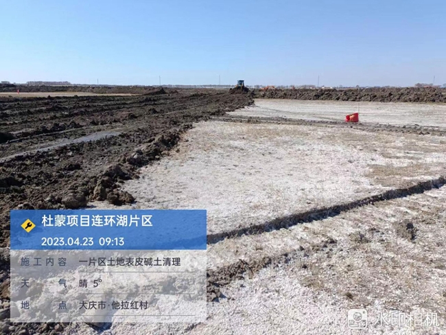 为积极响应国家关于粮食安全的重大战略,发挥生物修复技术在第二应用场景的优势,土壤修复团队审时度势将盐碱地治理项目作为新的突破口。2022年4月,在新冠疫情极其严重,公共交通不便的情况下,团队成员连夜自驾16小时1300余公里抵达黑龙江杜蒙县。在盐碱地现场勘查过程中,因道路泥泞,车辆无法进入,团队成员徒步完成7万亩盐碱地的现场勘查和初调样品采集工作。2023年3月30日,第一期1万亩盐碱地治理项目完成合同签署,为国家盐碱地治理提供有研方案。