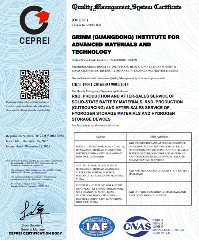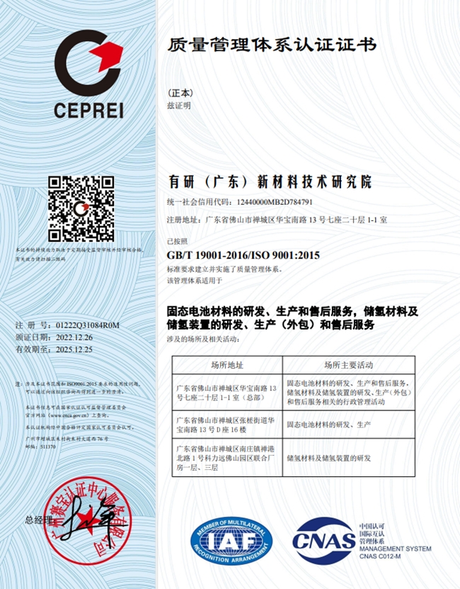 有研广东院自2022年7月建立并实施ISO9001质量管理体系以来,储氢工程化团队和固态电池团队先后获得ISO9001:2015质量管理体系认证证书,为新产品、新技术转化应用提供了重要保障。